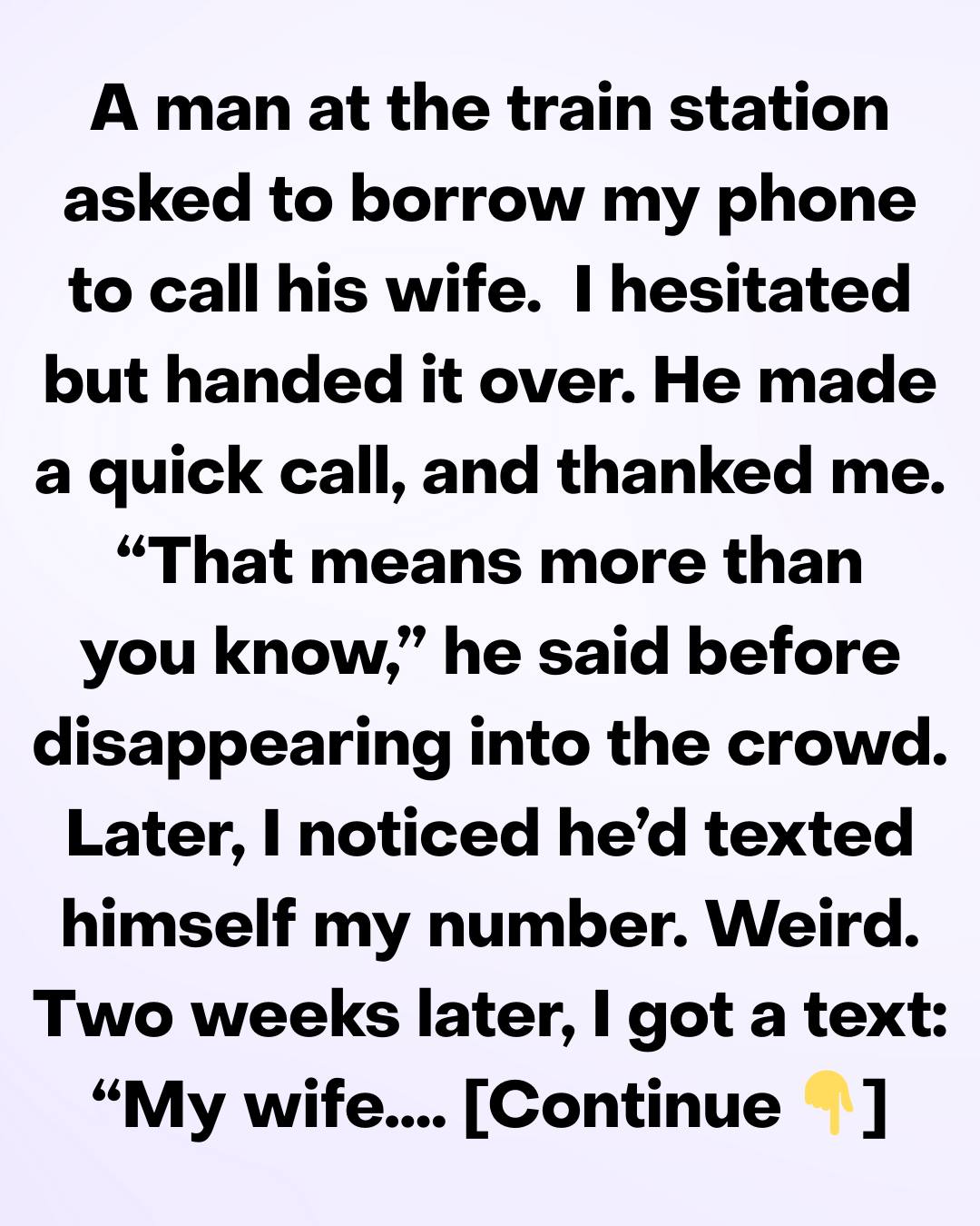 I was waiting for my train when a man approached me—middle-aged, tired eyes, suit wrinkled like he’d slept in it. He cleared his throat and asked softly, “Could I borrow your phone to call my wife? Mine just died.”