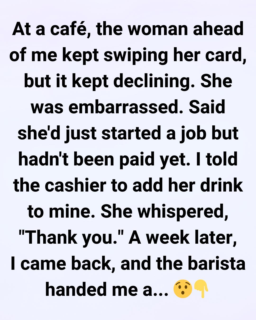 A week later, I swung by the same café on my way to work. I didn’t even get to place my order before the barista grinned at me and held out a cup topped with a perfectly foamed latte. “This one’s on the house,” she said.