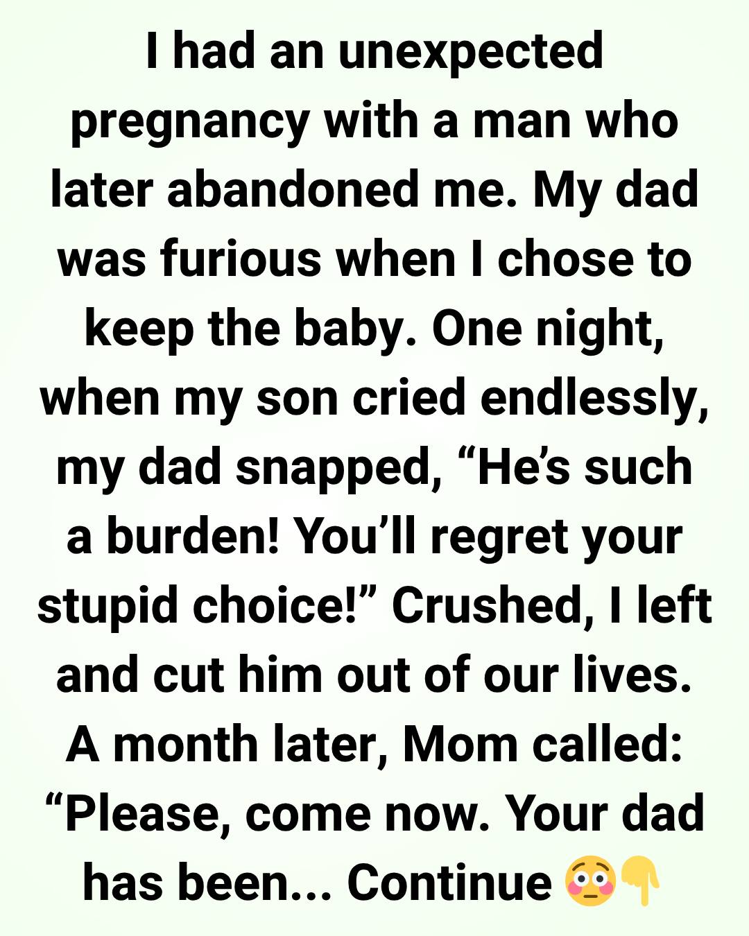 Weeks passed, and the silence from my parents’ house was deafening. My mom texted me now and then, asking how the baby was doing, but I kept my distance. I told myself I was protecting my son—from pain, from rejection, from the man who had once called him a burden. And yet, beneath my anger, there was a quiet ache. I missed my dad—or rather, the version of him I used to know before those cruel words tore us apart.