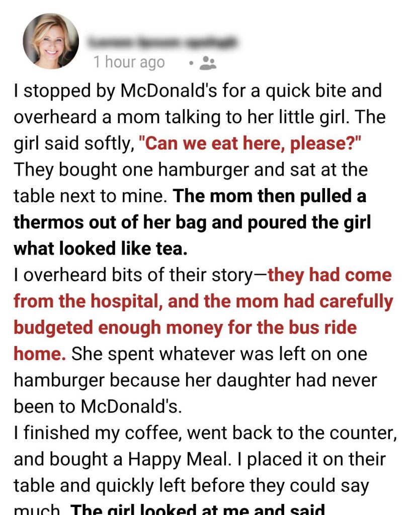 I stopped at McDonald’s for a quick meal and happened to overhear a mother speaking softly to her little girl. The child looked up at her and asked, “Can we eat here, please?” They ordered a single hamburger and sat down at the table next to mine. From her worn bag, the mother took out a small thermos and carefully poured what looked like tea for her daughter.