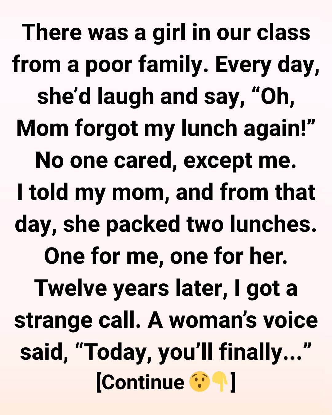 There was a girl in our class from a poor family. Every day, she’d laugh and say, “Oh, Mom forgot my lunch again!” No one cared, except me. I told my mom, and from that day, she packed two lunches. One for me, one for her.