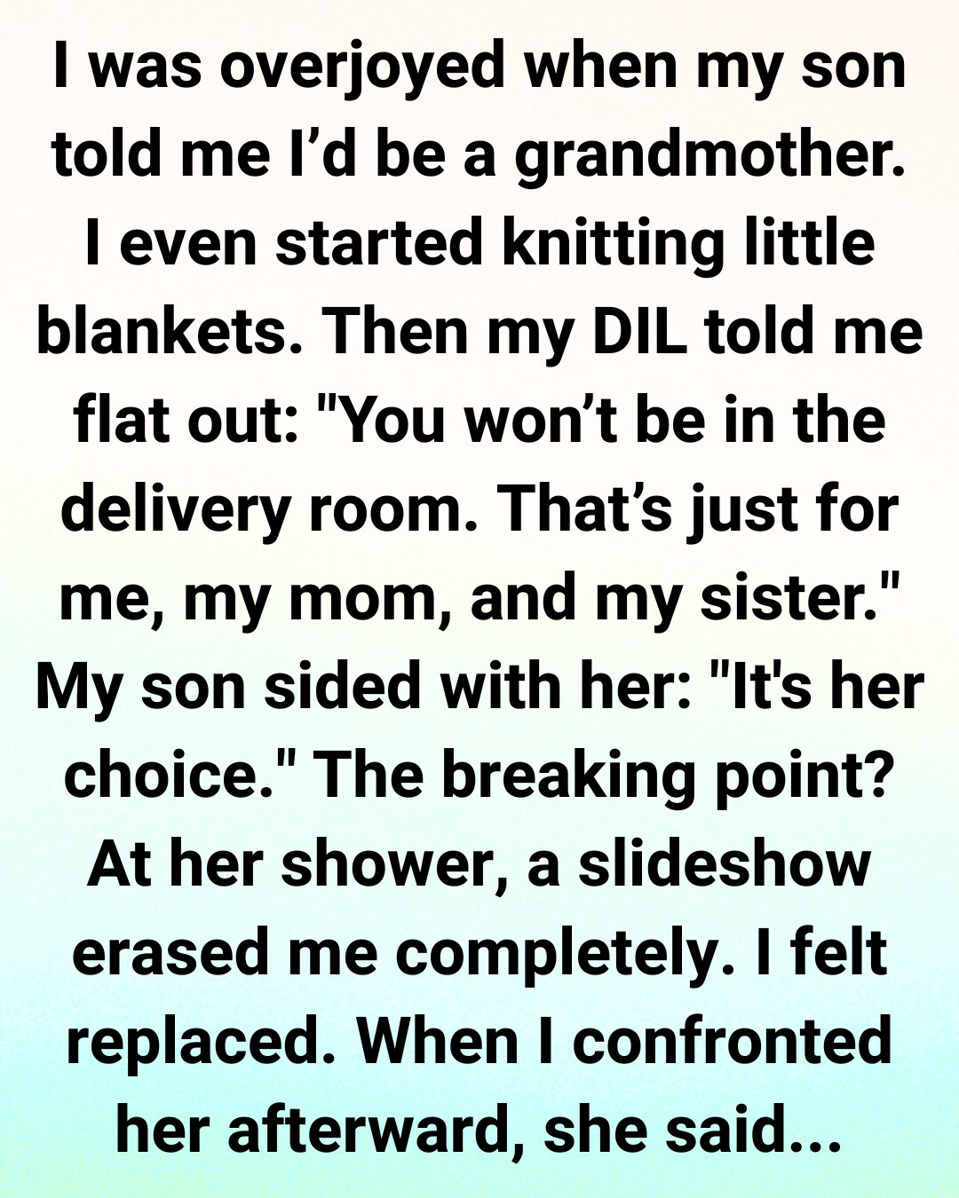 I (58F) was overjoyed when my son told me I was going to be a grandmother. I imagined finally sharing in those big family milestones — baby showers, the birth, first birthdays. I even started knitting tiny blankets in anticipation.