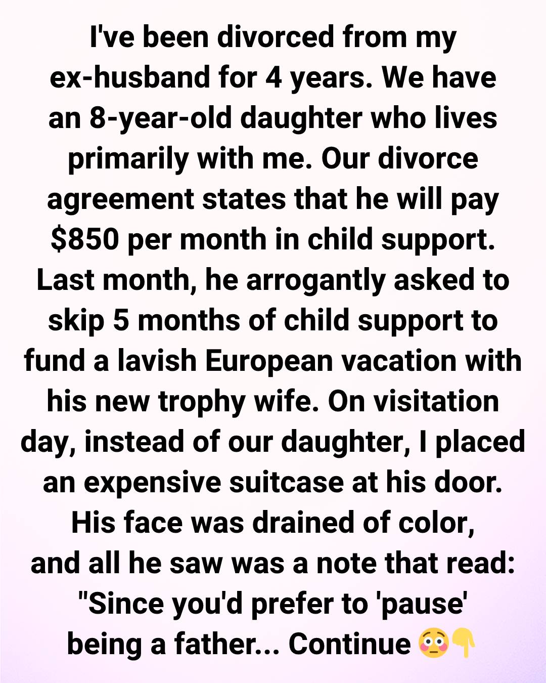 On his next visitation weekend, instead of dropping off Lily, I left a large suitcase at his front door. When he opened it, his face drained of color. On top sat a note that read: