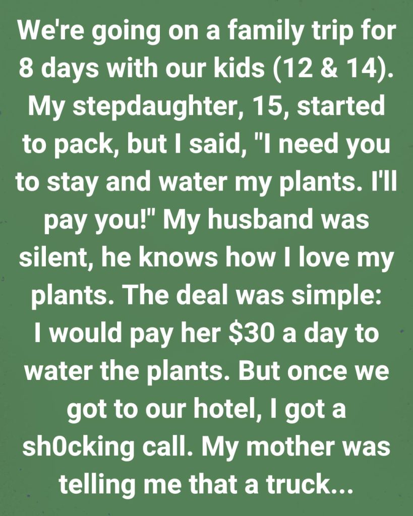 So, my stepdaughter stayed behind. The arrangement was simple: I’d pay her $30 a day to water the plants.