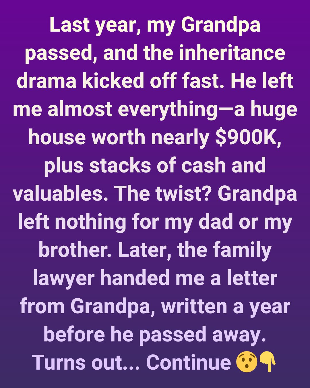 Last year, my grandpa passed, and the inheritance drama kicked off fast. I’m Richard, 33, and to my shock, he left me almost everything—a huge house worth nearly $900K, plus stacks of cash and valuables adding up to over $250K.