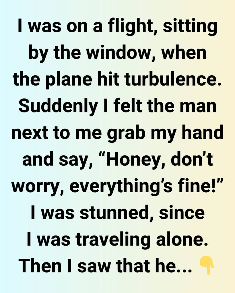 I was on a flight, sitting by the window, when the plane hit turbulence. Suddenly I felt the man next to me grab my hand and say, “Honey, don’t worry, everything’s fine!” I was stunned, since I was traveling alone. Then I saw that he had gone pale, and realized he’d gotten so nervous that he mistook me for his wife, who was actually sitting on his other side. I just smiled quietly so his wife wouldn’t notice. Turned out he was a very sensitive man.