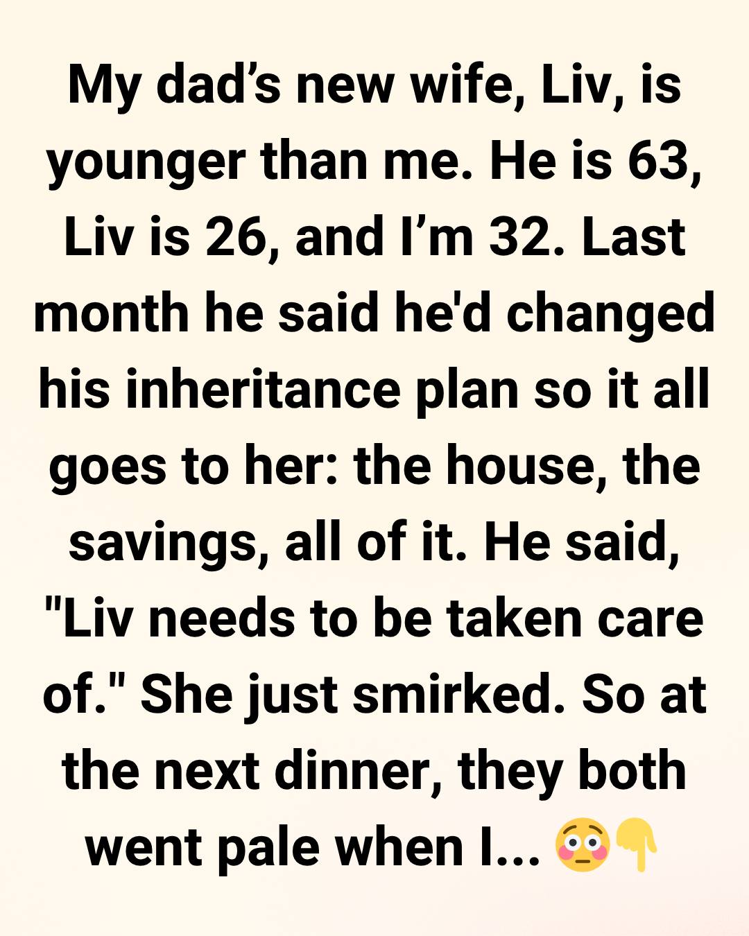 My dad’s new wife, Liv, is younger than me. He’s 63, Liv is 26, and I’m 32. Last month, he told me he’d changed his will so that everything would go to her: the house, the savings, all of it.