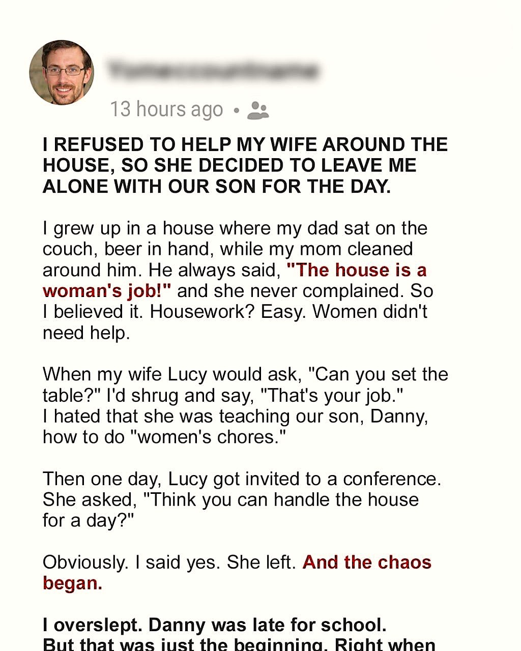 I always thought housework was easy—something women just complained about. But when my wife left me alone for a day to handle everything myself, I quickly realized I was the problem.