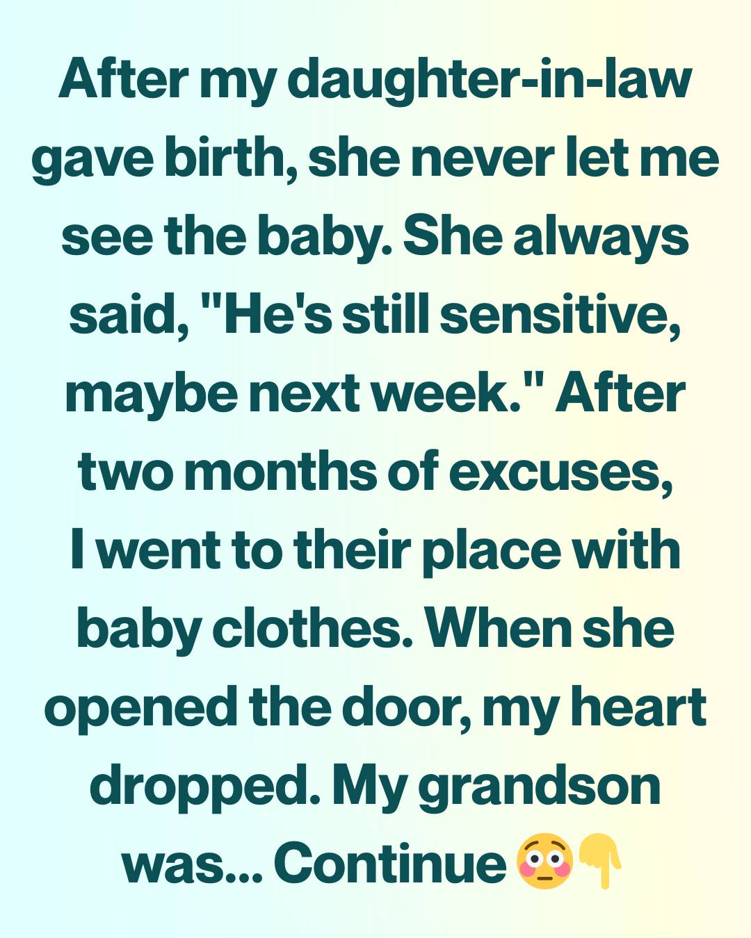 For two months after my daughter-in-law gave birth, I lived in a quiet storm of confusion and hurt. Every time I asked to visit the baby, she gave the same soft, distant answer: “He’s still sensitive… maybe next week.”