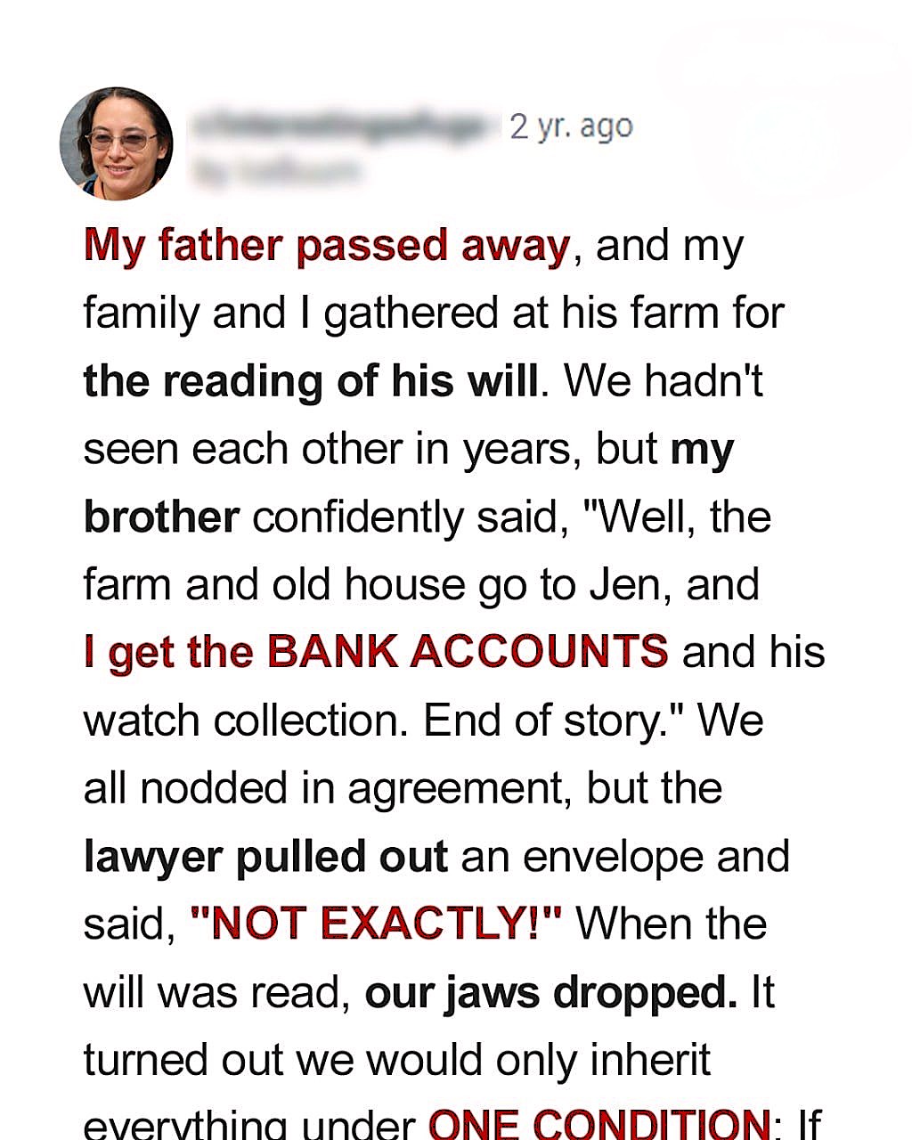 When my late father’s will revealed an inheritance tied to staying married for five years, I thought I could handle it. But my husband’s secret and my brother’s schemes shattered everything I believed.