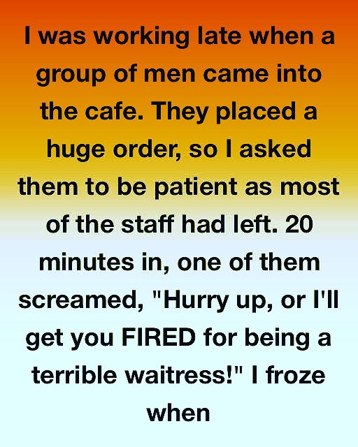 I was working late when a group of men came into the cafe. They placed a huge order, so I asked them to be patient as most of the staff had left. 20 minutes in, one of them screamed, “Hurry up, or I’ll get you FIRED for being a terrible waitress!” I froze when he slammed his fist on the counter, making the coffee machine rattle. My heart hammered against my ribs, and I could feel the flush rising in my cheeks, but I kept my composure. I had been working double shifts all week, trying to save up for my final semester of nursing school, and the thought of losing this job was terrifying.