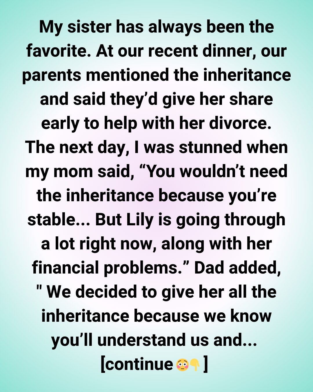 But what about me? I’ve always been the one to understand, and instead of being appreciated, I get my inheritance taken away. I do see where they’re coming from, but it feels so unfair to suddenly decide that I won’t receive my share just for the sake of my sister. This decision confirmed what I had always noticed: my parents have never seen or treated us equally. I always end up with the short end of the stick.
