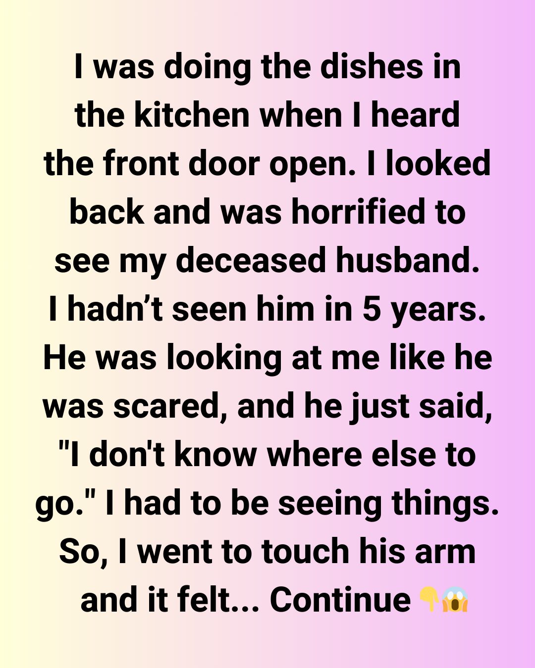 It was my deceased husband. I hadn’t seen him in five years, not since he died. He was standing there, looking older, like five years had passed for him too. He was looking at me like he was scared, and he just said, “I didn’t know where else to go.” I couldn’t move. I honestly thought I was seeing things.