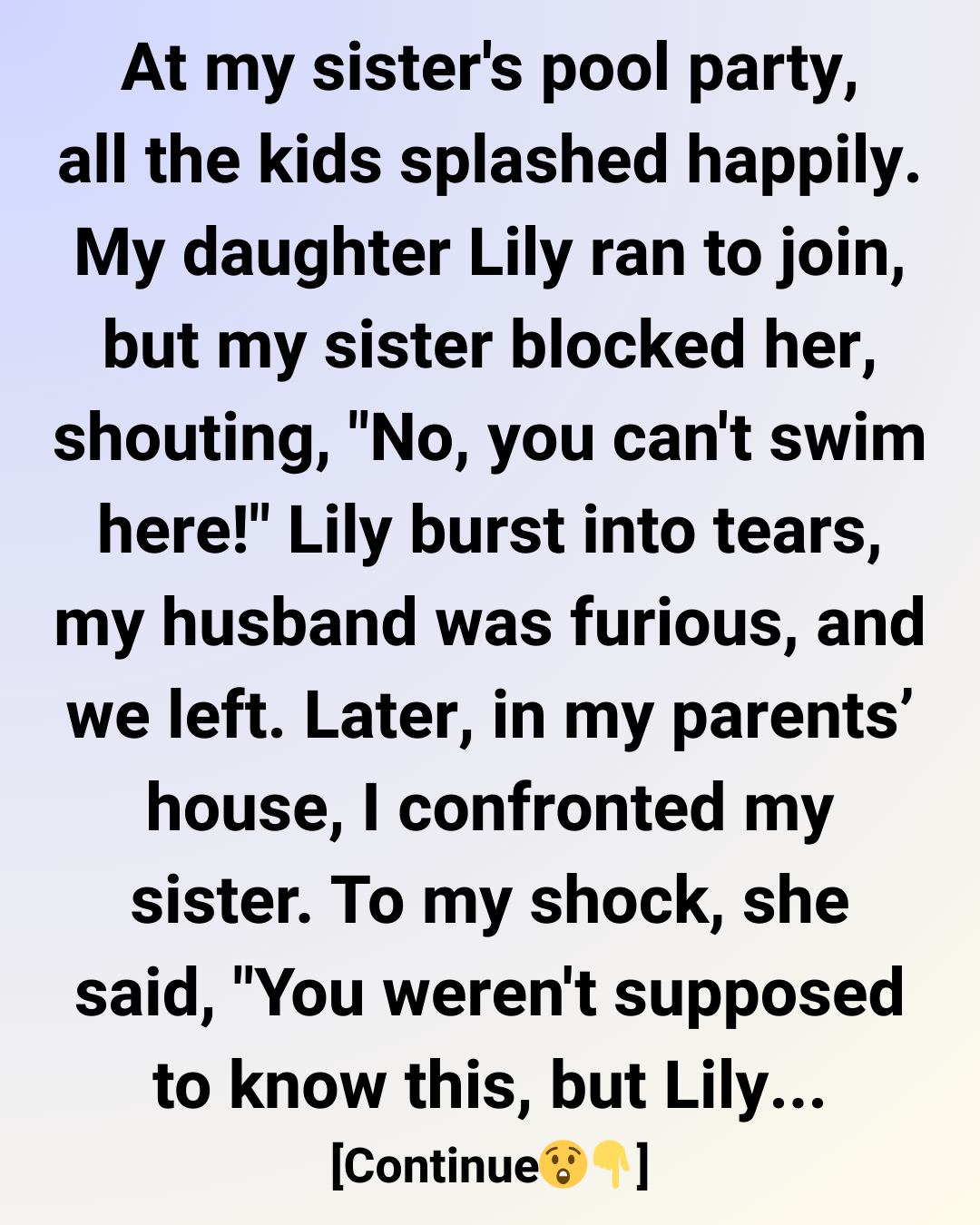 Lily burst into tears watching her cousins splash around. My husband was furious, and we left immediately, without saying goodbye. Later, at my parents’ house, I pulled my sister aside in the kitchen and demanded to know what was going on.