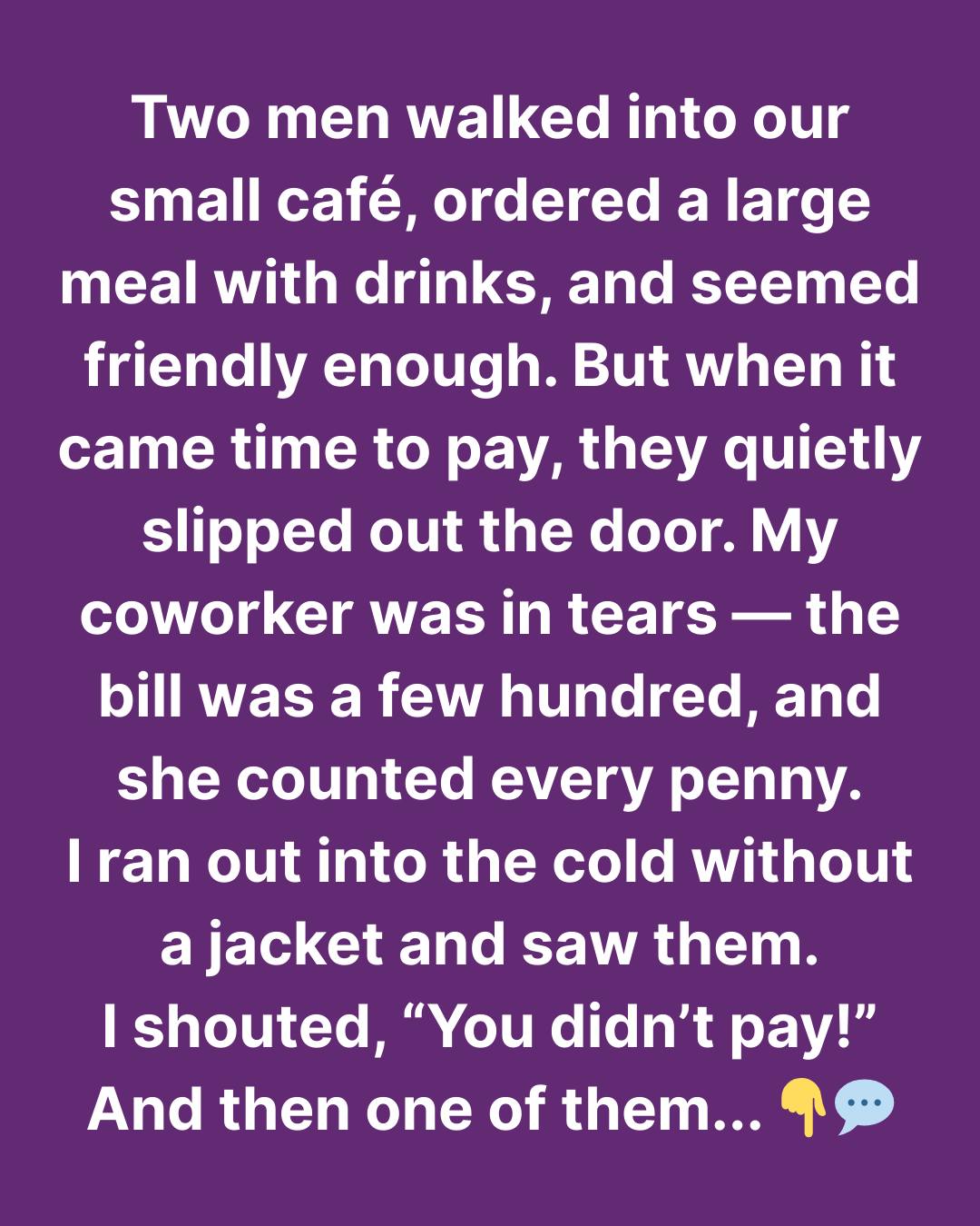 Half a block away, I spotted them. My heart pounded as I called out, “You didn’t pay!” My voice trembled, more from fear than from the cold.