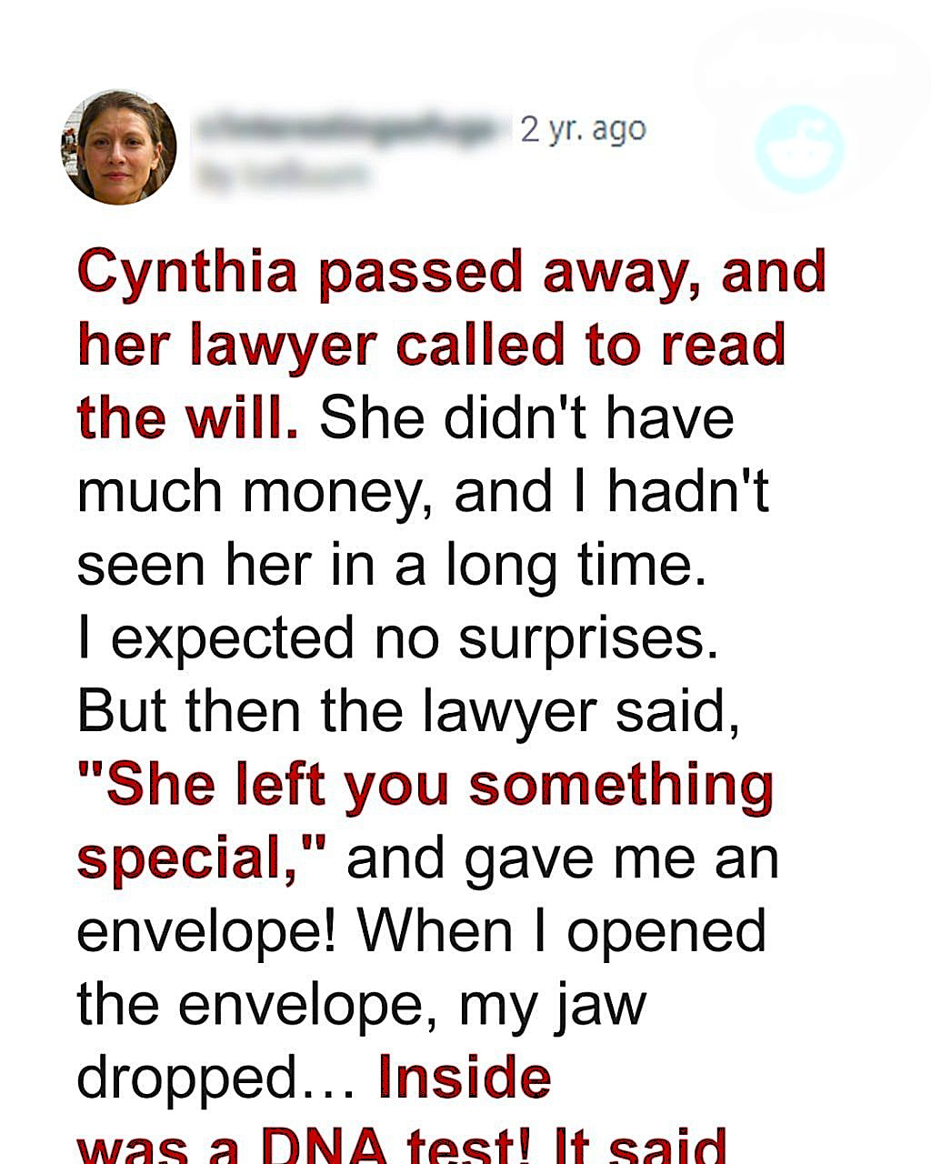 “I’m afraid she passed away last week. She named you in her will. I’ll need you to come in for the reading.”