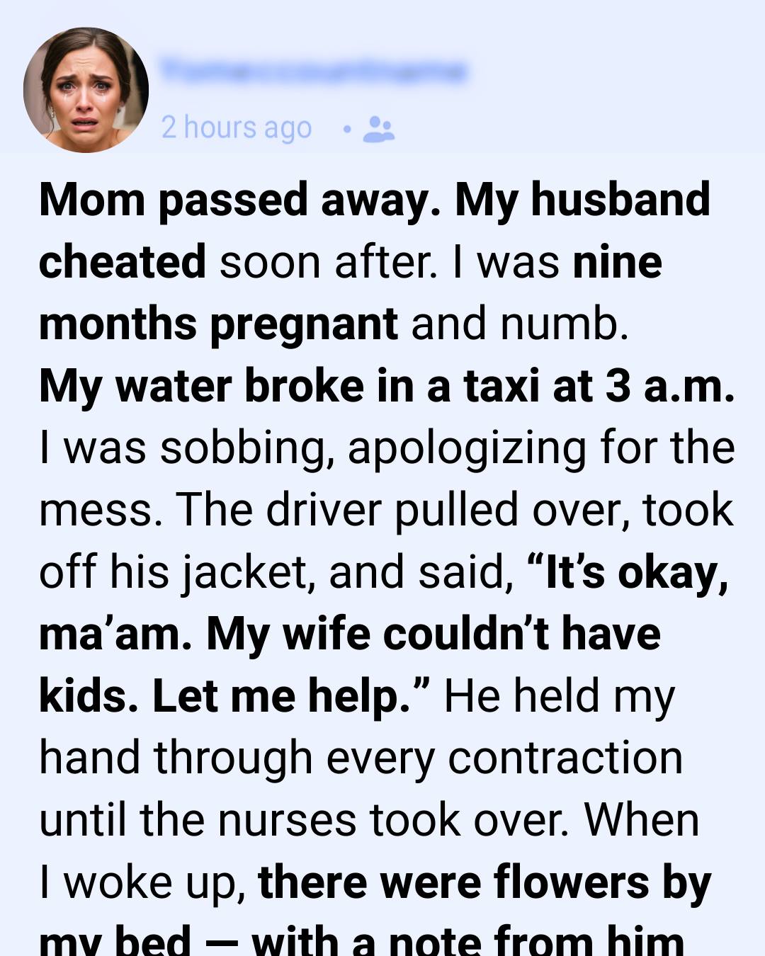 The night my water broke, it was 3 a.m. I was alone in our apartment. I called a taxi because I didn’t trust myself to drive. By the time I climbed into the back seat, contractions were already rolling through me like waves. Then it happened — water everywhere. I panicked, sobbing, apologizing over and over.