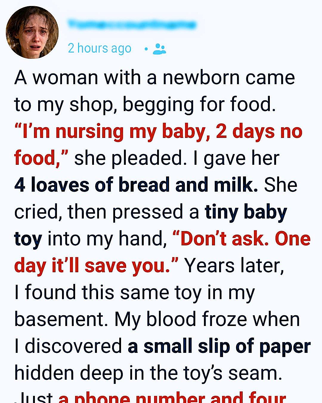 Before she left, she did something unexpected. She reached into the blanket and pulled out a tiny baby toy, soft and worn, its stitching slightly frayed. She pressed it into my palm like it mattered more than the food I’d given her.