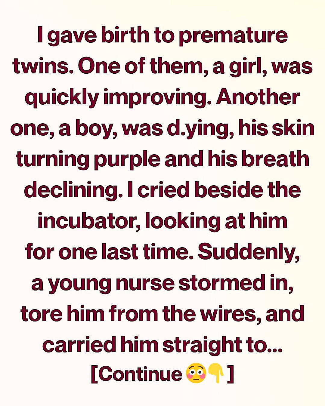 A young nurse rushed in, breathless, eyes wide like she’d just remembered something vital. She couldn’t have been older than her mid-twenties. Without saying a single word, she moved straight to my son’s incubator.