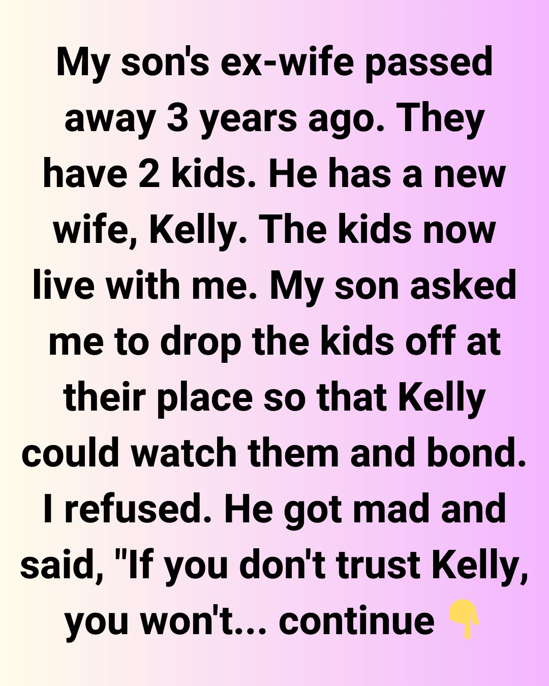 Now, he wants to take my grandkids away from me permanently, insists that they should live with him and Kelly and threatens me that I won’t be allowed in their house, and they’ll forbid me to meet my grandkids. He said that I’m treating his kids as my possessions, and he’s seriously worried that I will set their minds up against Kelly, which I never had in mind.