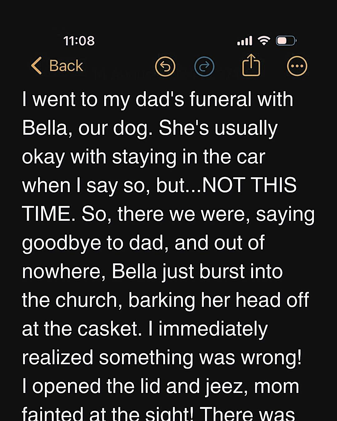 I climbed out of the car and stood outside the church, knowing I wasn’t ready to say goodbye to my father. We couldn’t even give Dad a proper funeral, I thought bitterly. Just then, Bella’s sharp bark snapped me out of my thoughts.