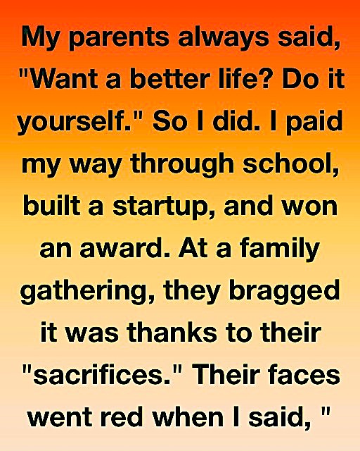 My parents always said, “Want a better life? Do it yourself.” So I did. I paid my way through school, built a startup, and won an award. At a family gathering, they bragged it was thanks to their “sacrifices.” Their faces went red when I said, “I didn’t take a dime from either of you after I turned eighteen.“