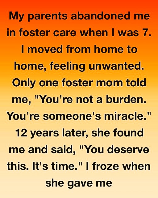 My parents abandoned me in foster care when I was 7. I moved from home to home, feeling unwanted. Only one foster mom told me, “You’re not a burden. You’re someone’s miracle.” 12 years later, she found me and said, “You deserve this. It’s time.” I froze when she gave me a thick envelope, shaking slightly in her hand.