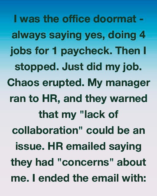 My message is simple: never let loyalty to a job replace loyalty to yourself. Your competence should be recognized and compensated, not exploited. If you find yourself doing four jobs for one paycheck, remember this story, draw your line, and stand firm. The chaos that erupts might just be the sound of the system correcting itself.