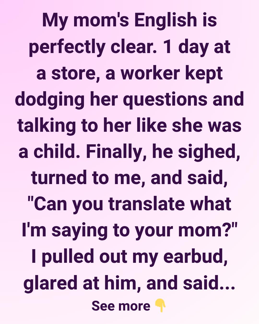 Well, I, with a very disgusted look on my face and in an aggravated tone, said, ‘My mom can understand English perfectly fine.’ I didn’t wait for him to respond and instead put in my earbuds and looked back at my phone, completely ignoring him. I wasn’t loud or anything, but enough people were paying attention for him to look very embarrassed as he glanced around to look at how people are reacting (his coworkers were smirking).