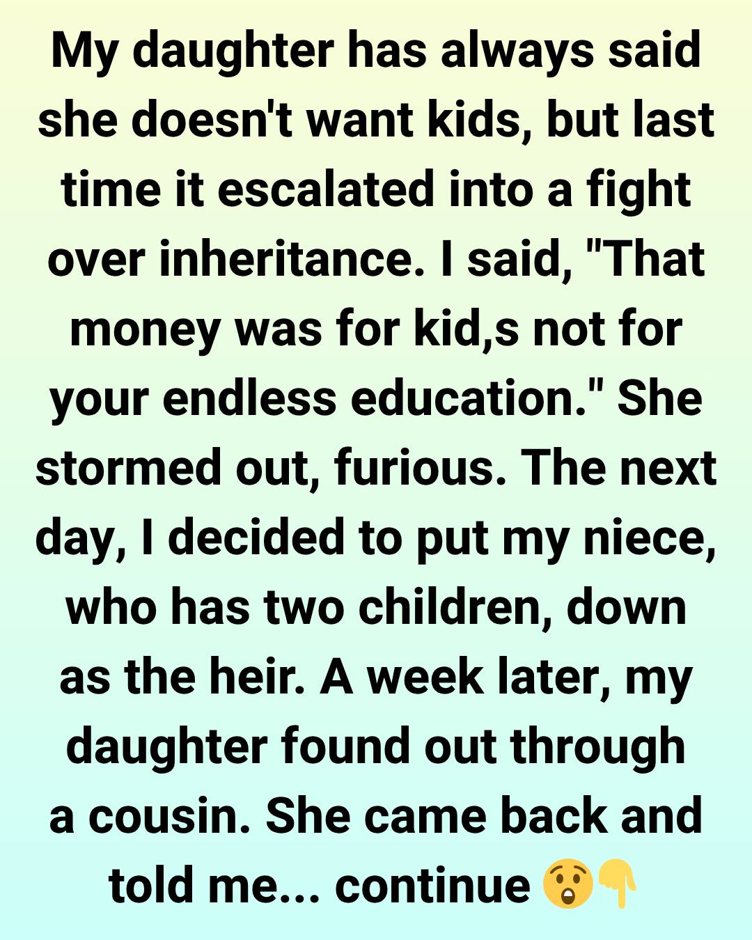 The next day, still upset, I made a decision I thought was practical at the time: I rewrote my will. Instead of leaving everything to my daughter, I put my niece down as the heir. She has two children, and I convinced myself that at least this way the money would serve the purpose I always imagined—supporting and raising a family.
