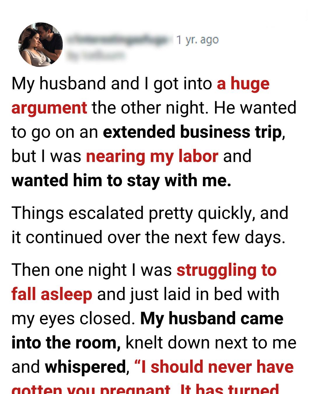 My husband and I got into a huge argument the other night. He wanted to go on an extended business trip, but I was nearing my labor and wanted him to stay with me so we could be together when our baby was born.