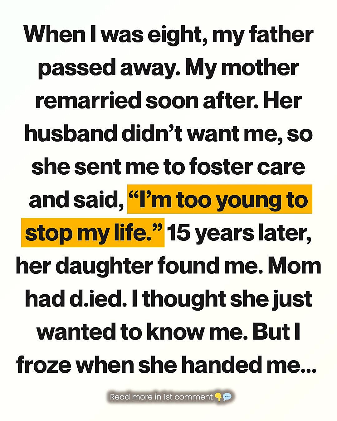 But then she swallowed hard and said, “Our mom just d.ied. It was all so sudden. But… she left this to you.”