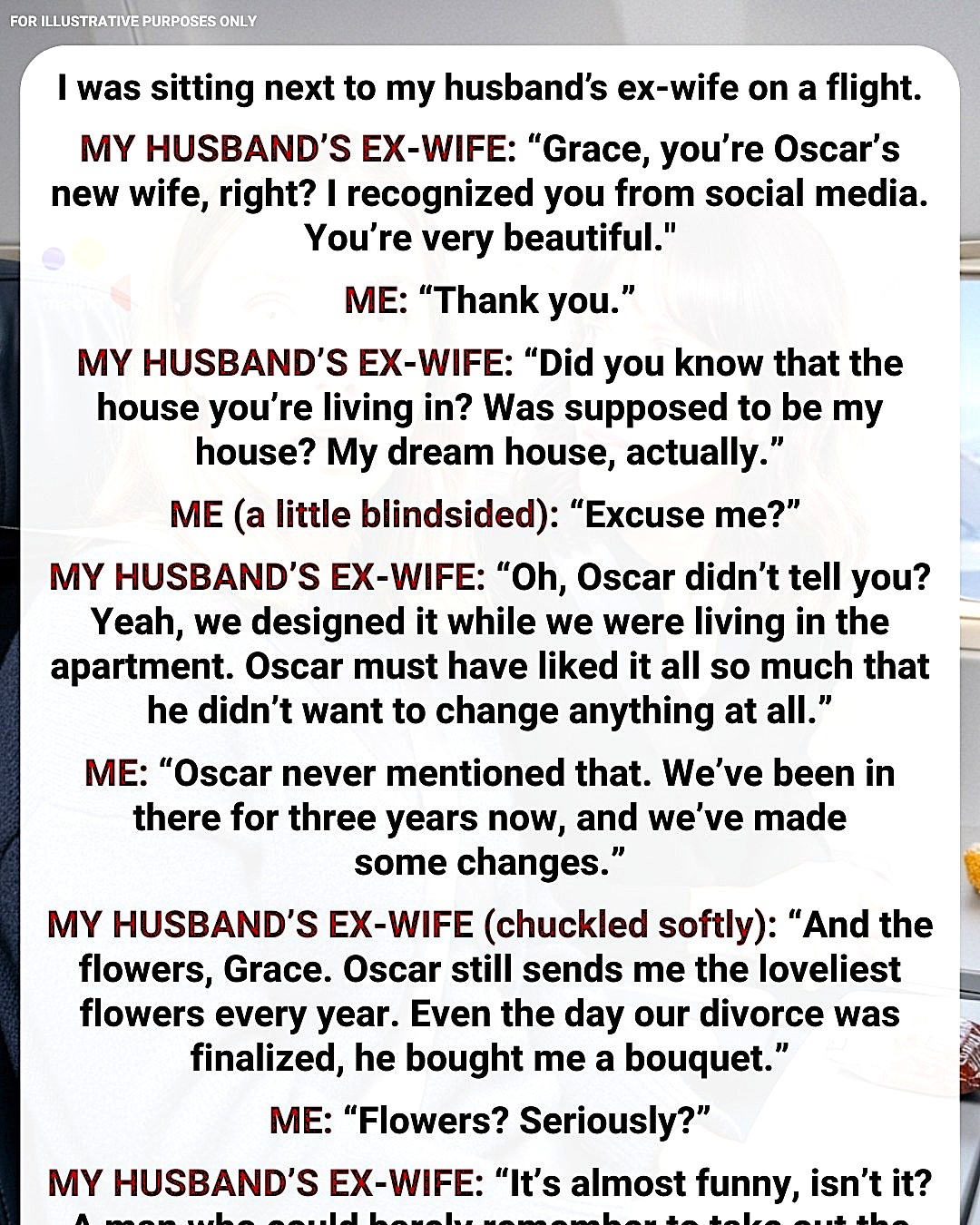 For the rest of the flight, I stared blankly at the seat in front of me, my mind replaying every moment of my marriage—now poisoned by her revelations.
