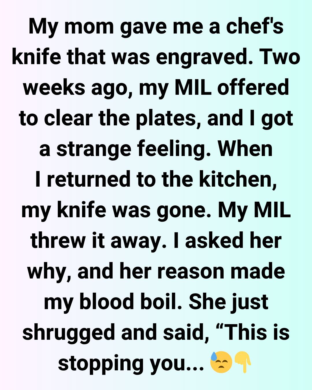 When I returned to the kitchen to get the desserts, my knife was gone. I asked my MIL about it, and she said, “It looked dangerous,” so she tossed it in the trash. But the worst part was that she was smiling like she’d done me a favor.