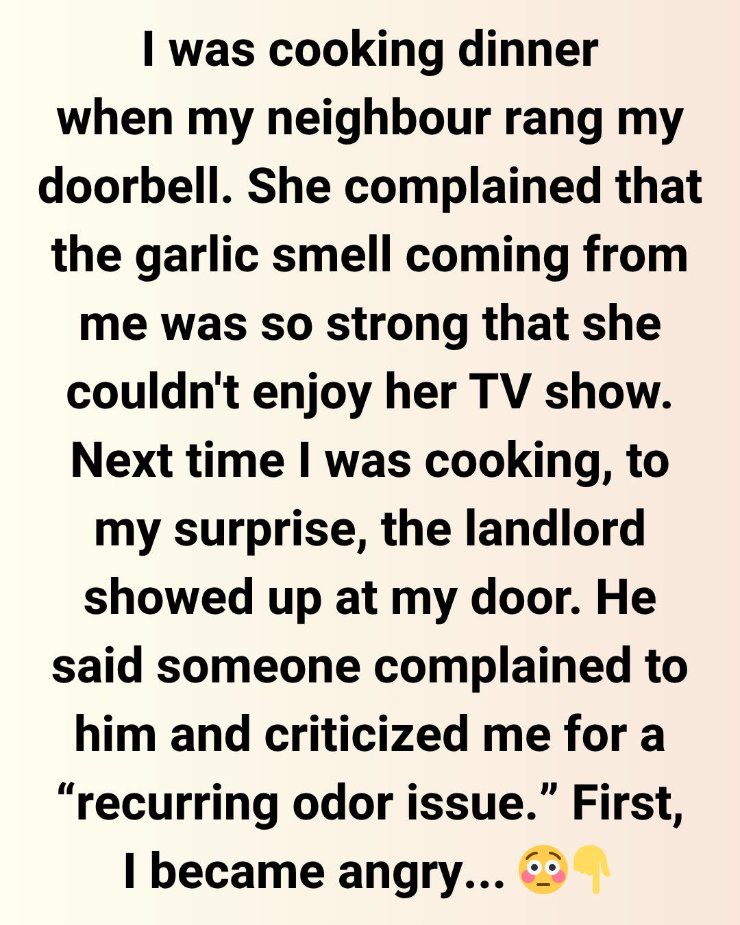 On a Friday night, I was cooking dinner when someone rang my doorbell. I was surprised to see Maria at my door. She started to complain that the garlic smell coming from my flat was bothering her through the wall. She said it was so strong that she couldn’t enjoy her favorite TV show and asked me not to use so much garlic next time.