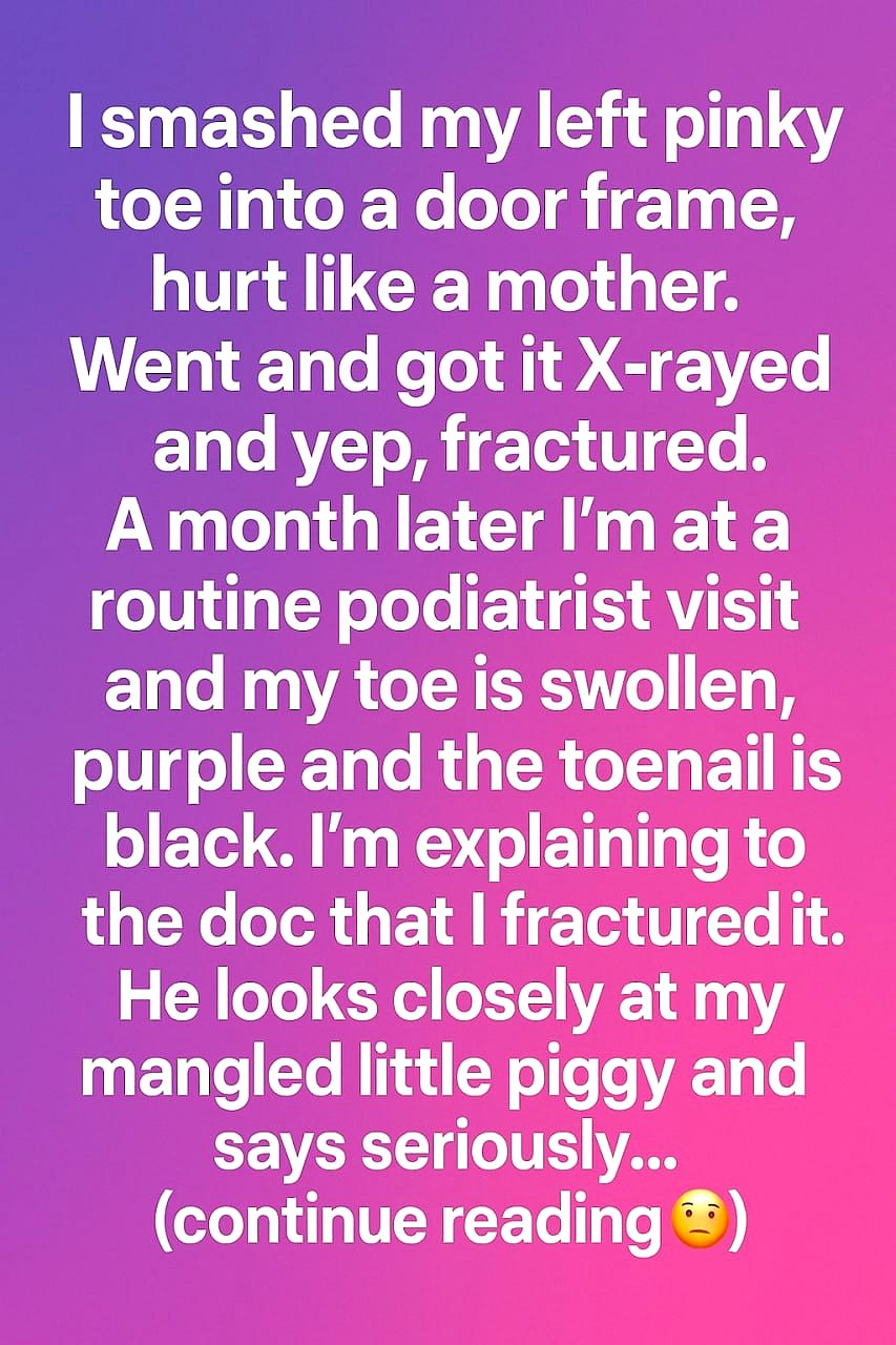 It started with a stub. A stupid, clumsy stub. The kind that makes you hop on one foot, hiss in a quiet rage, and then forget about two minutes later. I was rushing, as always, trying to get out the door, and my little toe found the unforgiving edge of the coffee table. Just a little bump, I told myself, barely sparing it a glance as I limped out to face another chaotic day.But it didn’t heal.