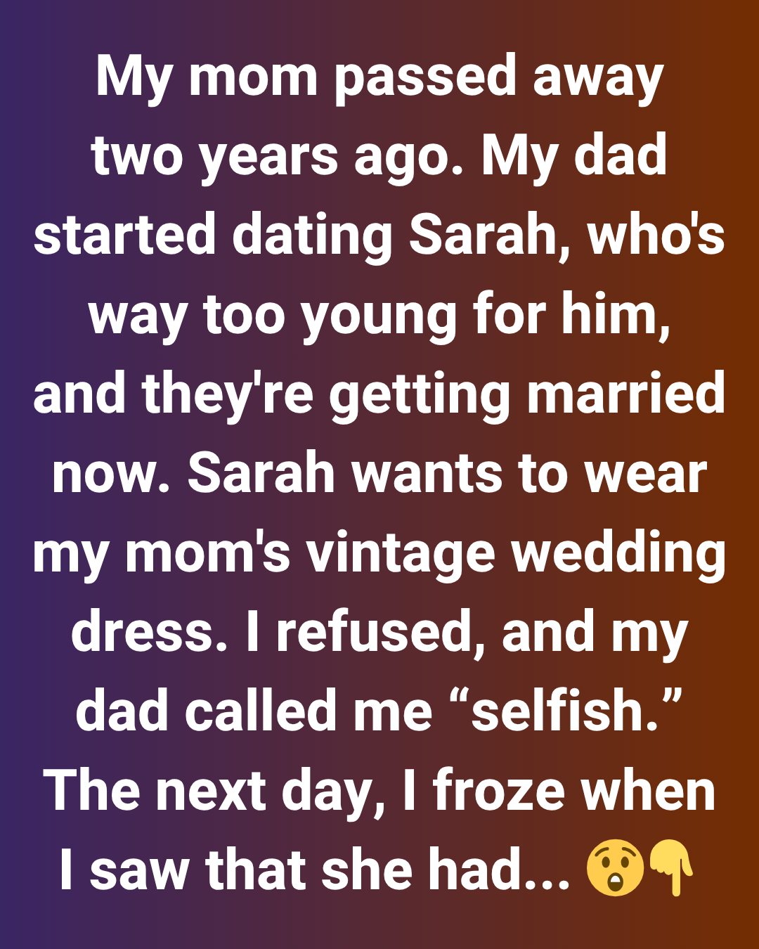 It’s an old silk wedding gown from the ’70s, something my mom treasured her whole life. When I found out Sarah wanted to wear it for her own wedding with my dad, my blood ran cold. That dress isn’t just a piece of fabric—it’s a tangible connection to my mom. I’ve kept it safe since she passed, always imagining I might try it on one day. It’s one of the few things that still feels like her.