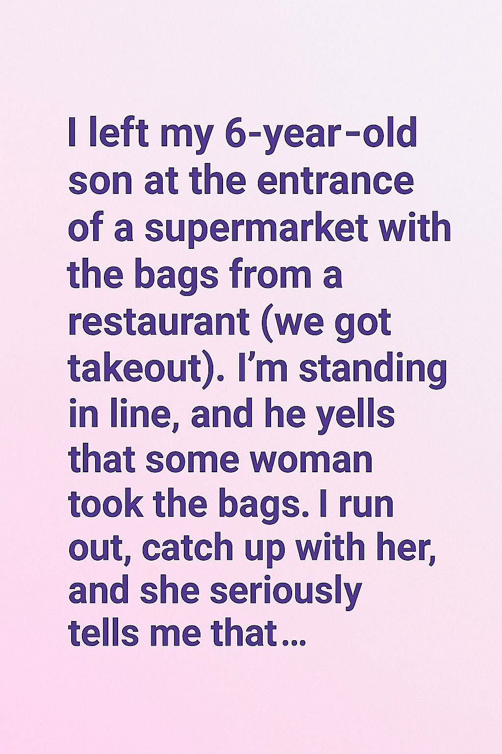 I left my 6-year-old son at the entrance of a supermarket, holding the bags from our takeout. While I was in line, he suddenly yelled that a woman had taken the bags. Panicked, I ran out and caught up with her, only to hear that she thought the food had been abandoned and wanted to “donate it to someone who needed it.”