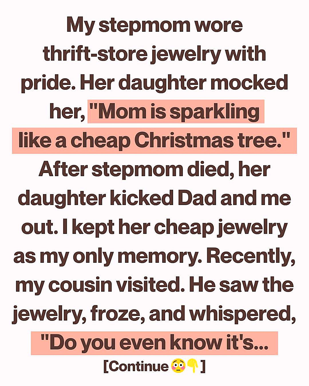 We left with nothing but clothes, a few books, and the small tin box where my stepmom kept her jewelry. I took it without thinking—just something to hold onto, a tiny anchor to the only maternal bond I’d ever known. Most of it looked like thrift-store pieces: faded necklaces, uneven pearls, mismatched earrings. But they smelled like her perfume and that was enough.