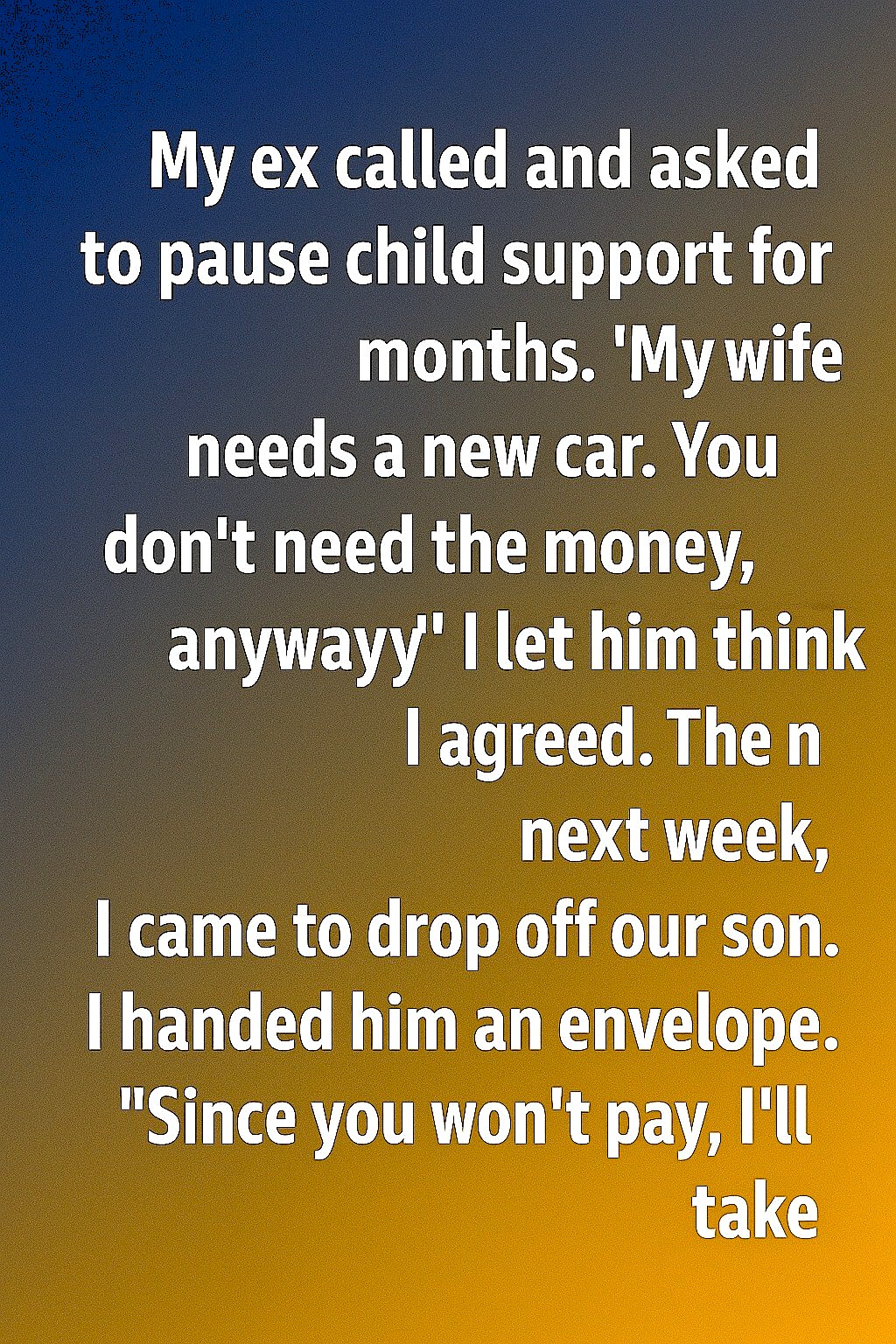 My ex called and asked to pause child support for months. “My wife needs a new car. You don’t need the money, anyway,” I let him think I agreed.The next week, when I came to drop off our son, I handed him an envelope.