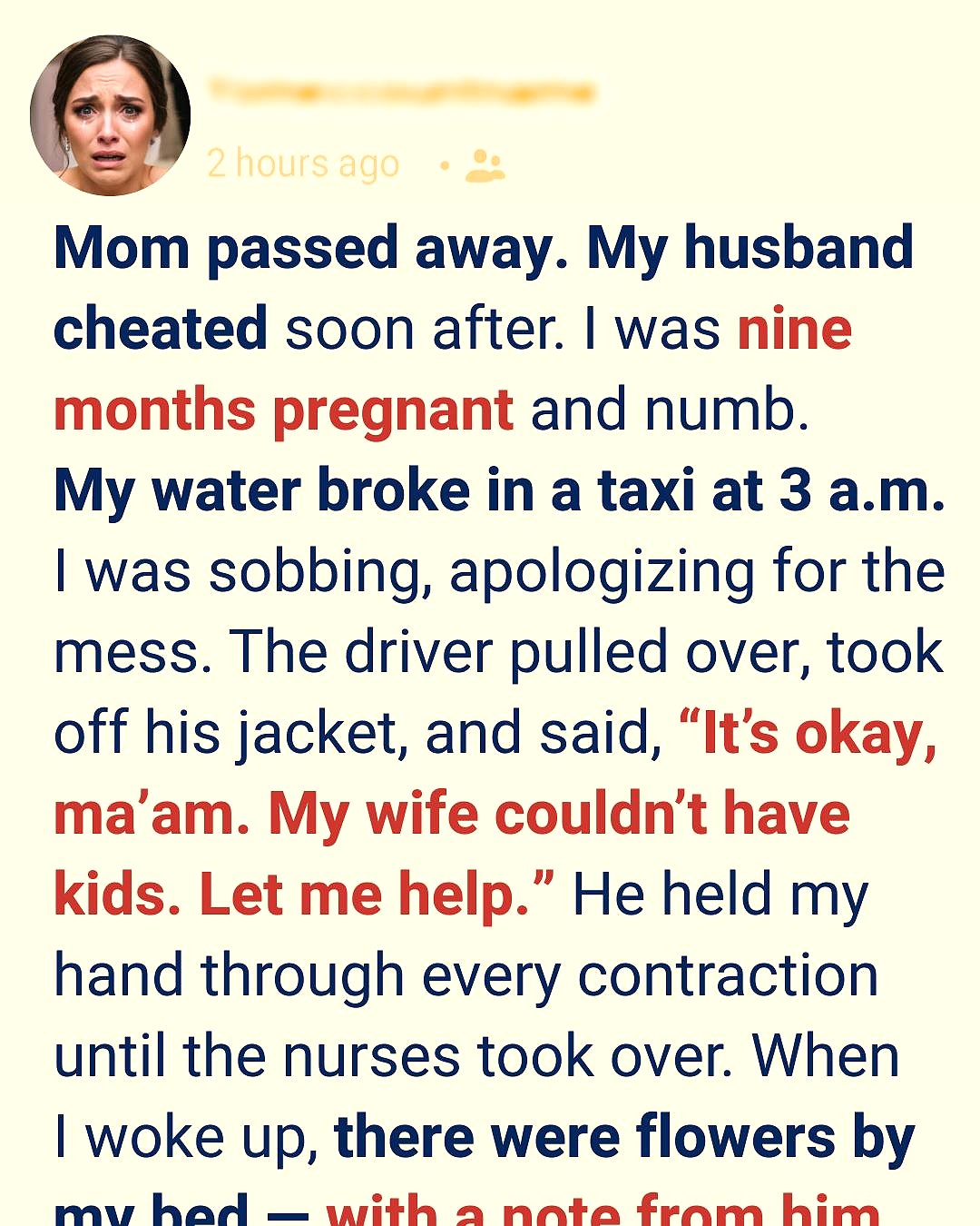 The night my water broke, it was 3 a.m. I was alone in our apartment. I called a taxi because I didn’t trust myself to drive. By the time I climbed into the back seat, contractions were already rolling through me like waves. Then it happened — water everywhere. I panicked, sobbing, apologizing over and over.