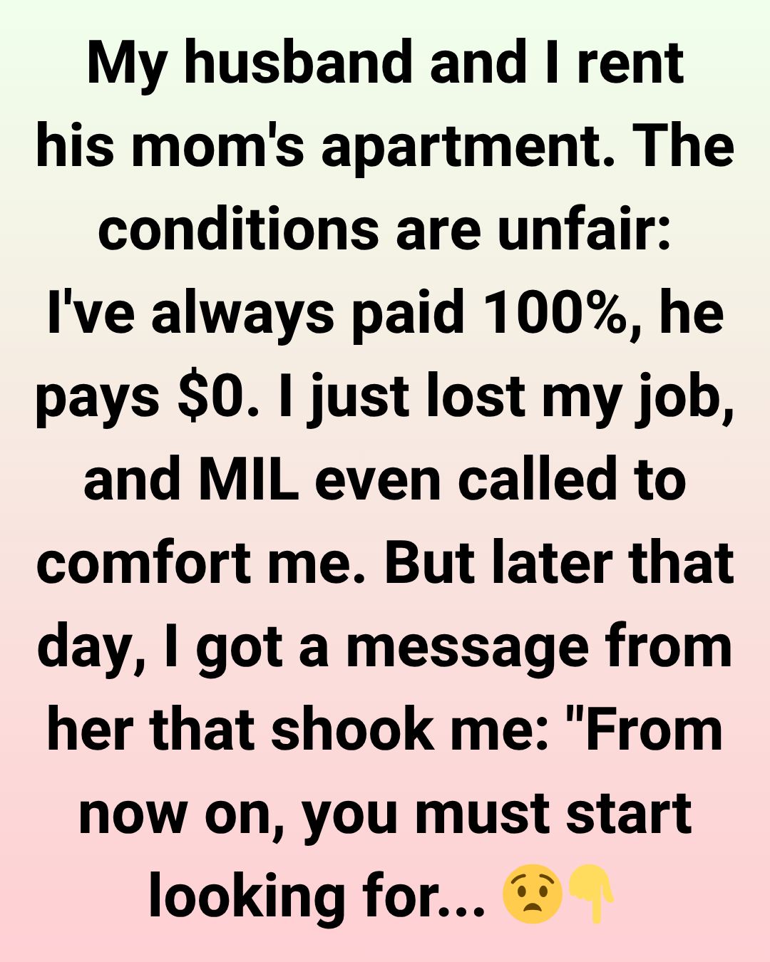 She even added that since I don’t have children with her son, I’m not actually related to her in any way. If I don’t pay, she said, I’ll be evicted. So apparently, in her mind, her son gets free housing forever, while I’m just an ATM with a pillow.