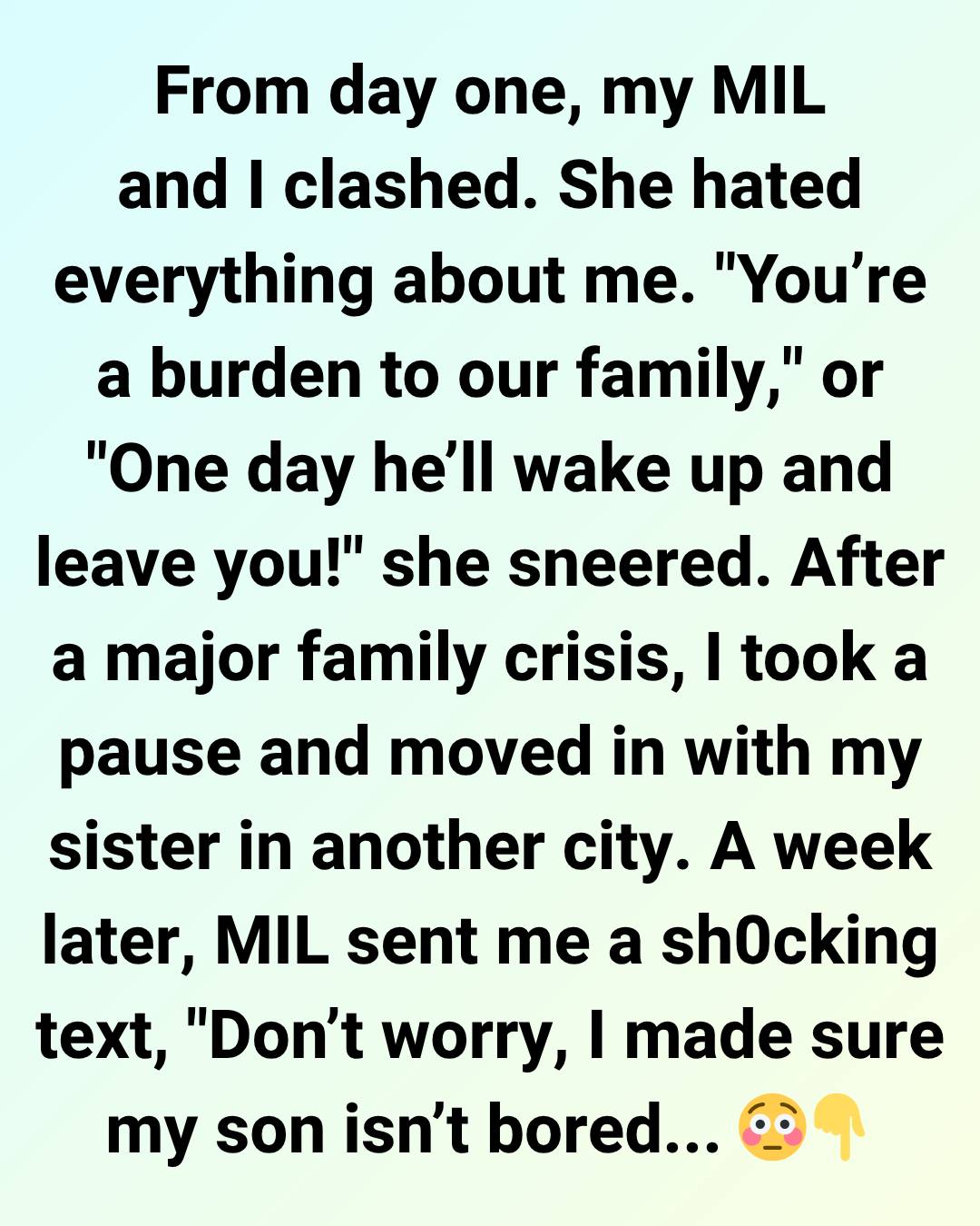 When things got tense between us, I decided to take a short break and stay with my sister in another city. About a week later, I got a text from my MIL that said: ‘Don’t worry, I made sure my son isn’t bored without you—and trust me, he’s not bored at all.’