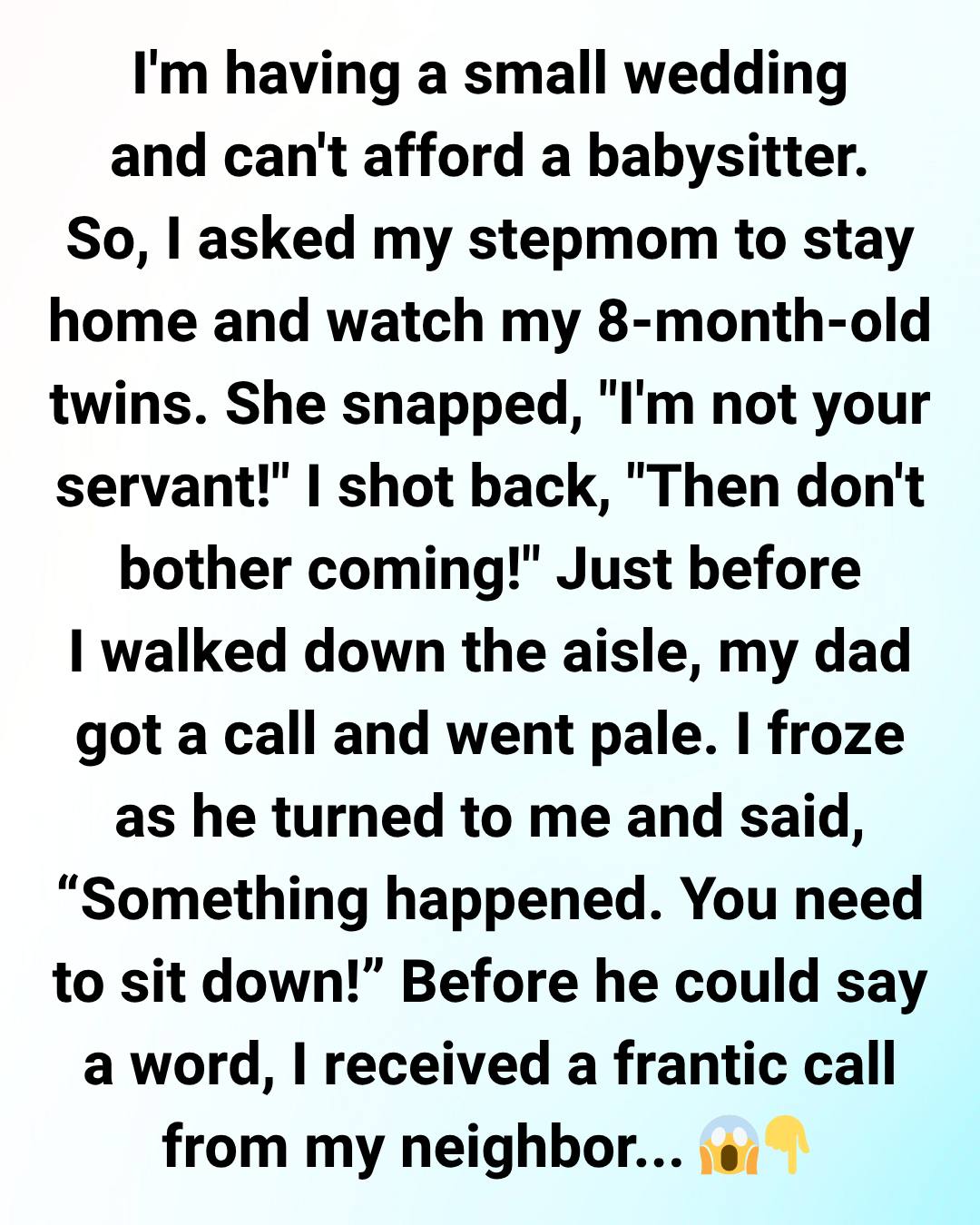 I was planning a small, intimate wedding and, with every penny accounted for, I couldn’t afford a babysitter. So, I asked my stepmom if she could stay home and watch my 8-month-old twins during the ceremony.