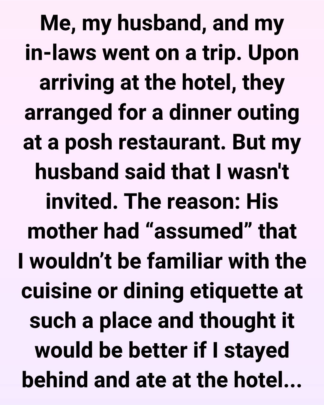 I (26F) went on a “family trip” with my in-laws two weeks ago. My mother-in-law has always considered me a bit “ignorant” and “backward.” She believes that because I come from a lower-class family compared to hers, I lack proper “etiquette.”