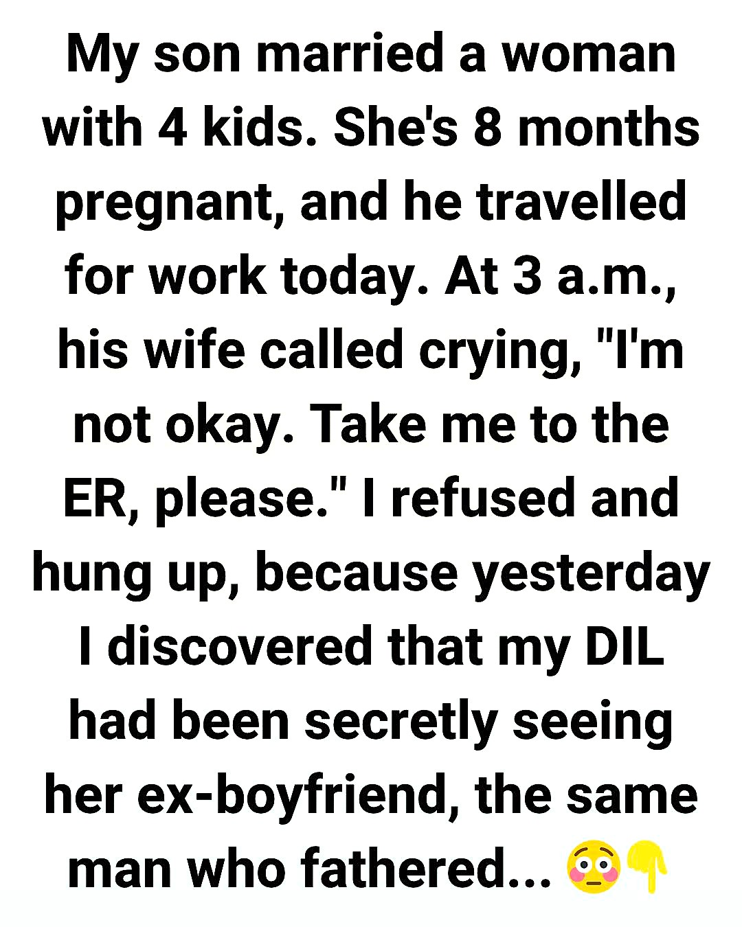 What hurt even more was learning that while she was seeing my son, my daughter-in-law had also been secretly seeing her ex-boyfriend—the same man who fathered her two youngest children. My son knows about it. He married her anyway, even though he isn’t sure if the baby she’s carrying is his. But I can’t be that forgiving.