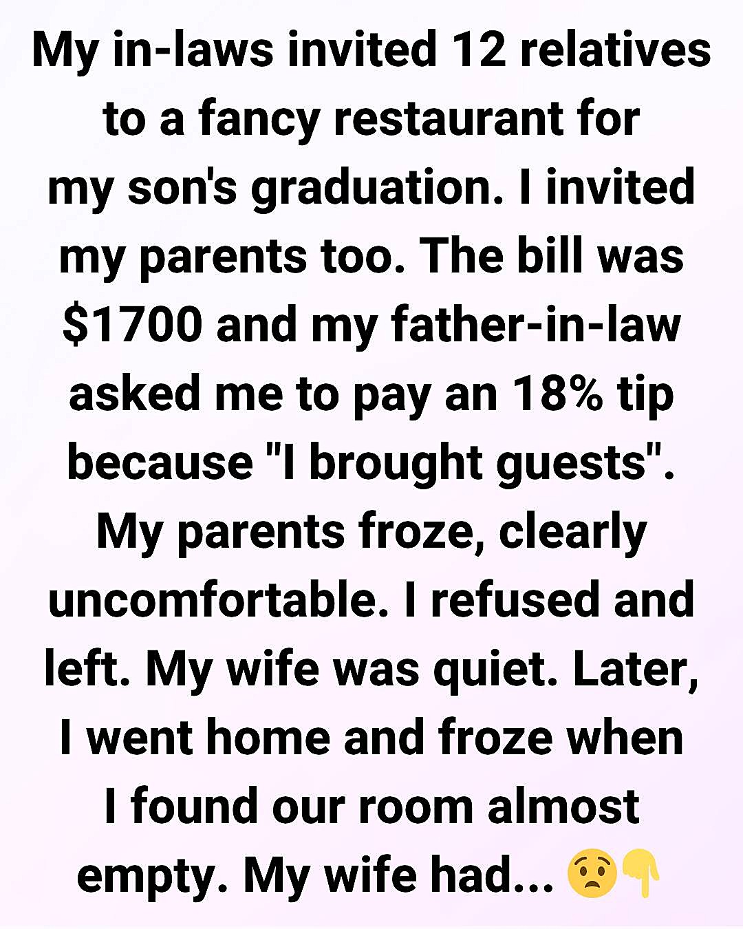 The dinner went smoothly at first. Everyone toasted to my son’s future, shared stories, and laughed. My parents, who aren’t used to such upscale places, looked proud but a little out of place. When the bill came, my father-in-law reached for it confidently. “I’ve got it,” he said, handing over his card. It was nearly $1,700. Then he turned to me and added casually, “You can cover the tip — eighteen percent should do. You brought guests, after all.”