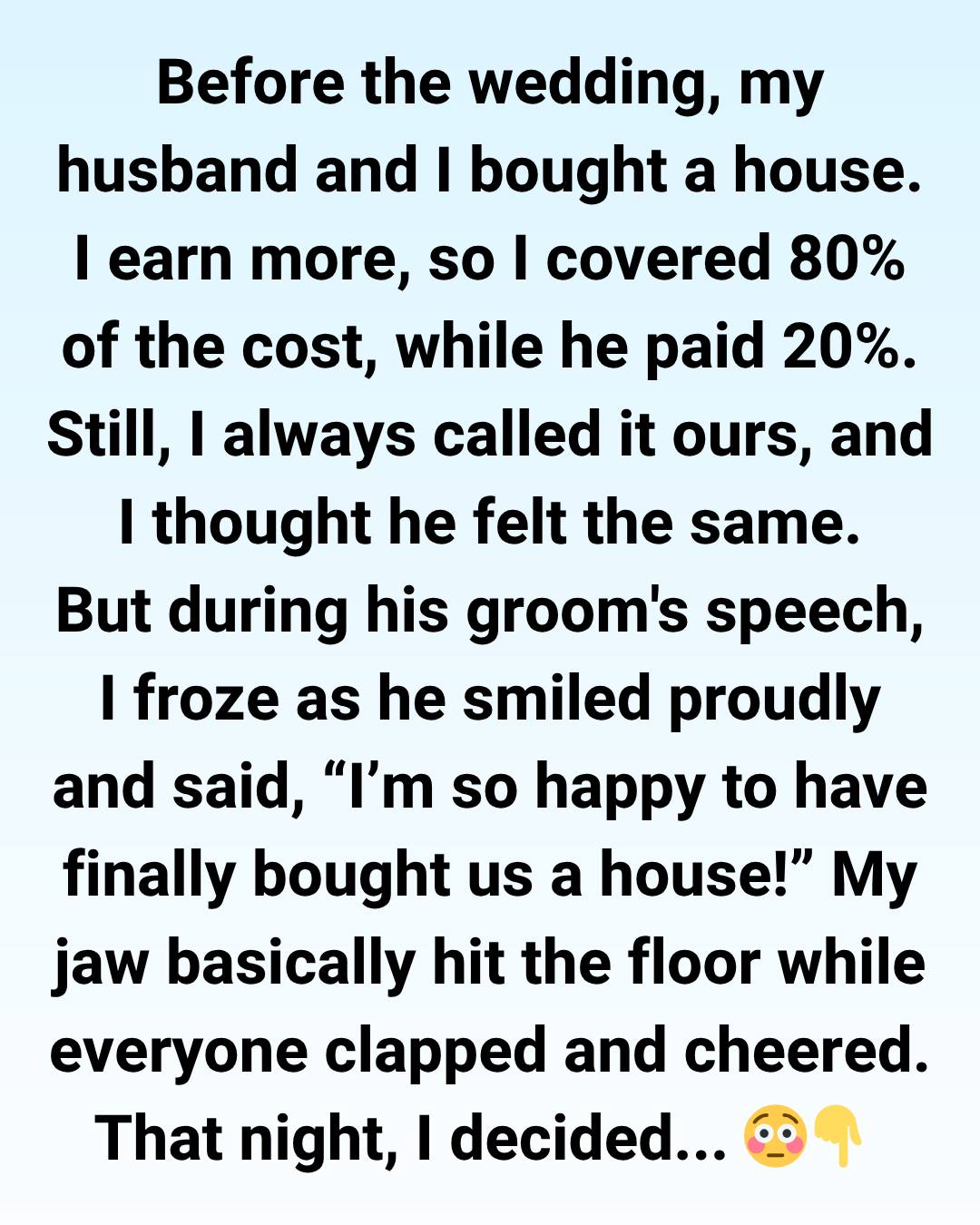 Before the wedding, my now-husband and I bought a house together. I earn more, so I paid for about 80% of it, while he covered the remaining 20%. Still, I always referred to it as our house, and I truly believed he felt the same way.