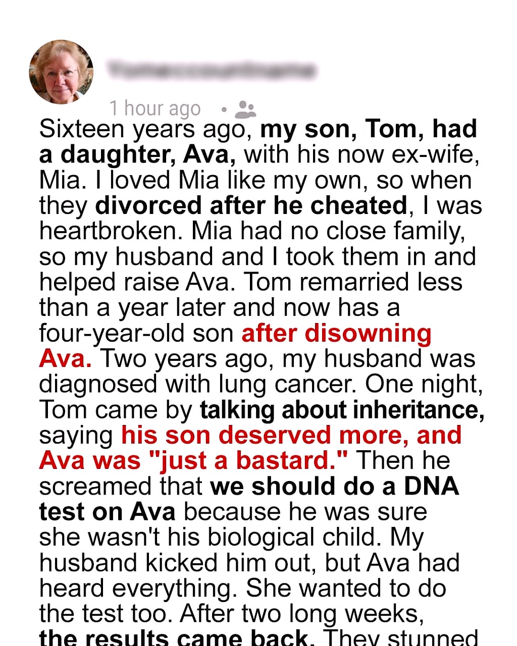 Sixteen years ago, my son, Tom, had a daughter named Ava with his now-ex-wife, Mia. My husband and I chose to help raise our granddaughter after her father disowned her. But we didn’t anticipate him wanting paternity when he discovered how we wanted to provide for her future.