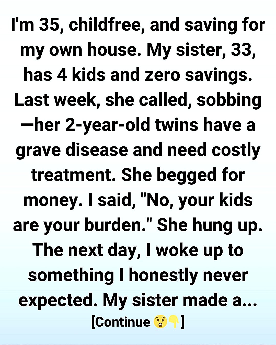 A few weeks ago, she called me in tears. Her youngest twins—both just two years old—had fallen seriously ill and needed urgent, expensive treatment. She asked if I could help financially. I told her no. I explained that I’ve been saving for my own goal for years, and that her children weren’t my responsibility. She hung up immediately, still crying.